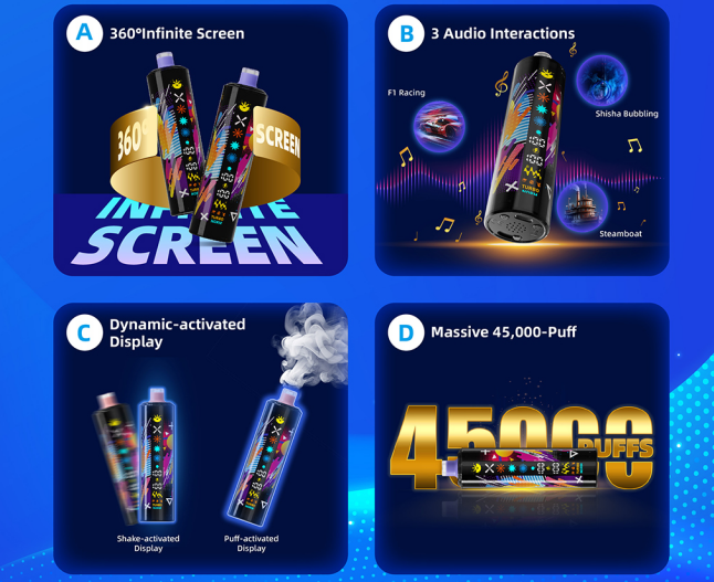 The Maskking FEXO 45,000, however, includes three selectable audio modes—F1 Racing, Steamboat, and Shisha Bubbling—allowing users to tailor the sound to their preference. Whether you want a high-energy hit, a rhythmic tone, or an immersive hookah-style bubbling, the FEXO delivers a richer and more versatile multi-sensory vaping experience.
